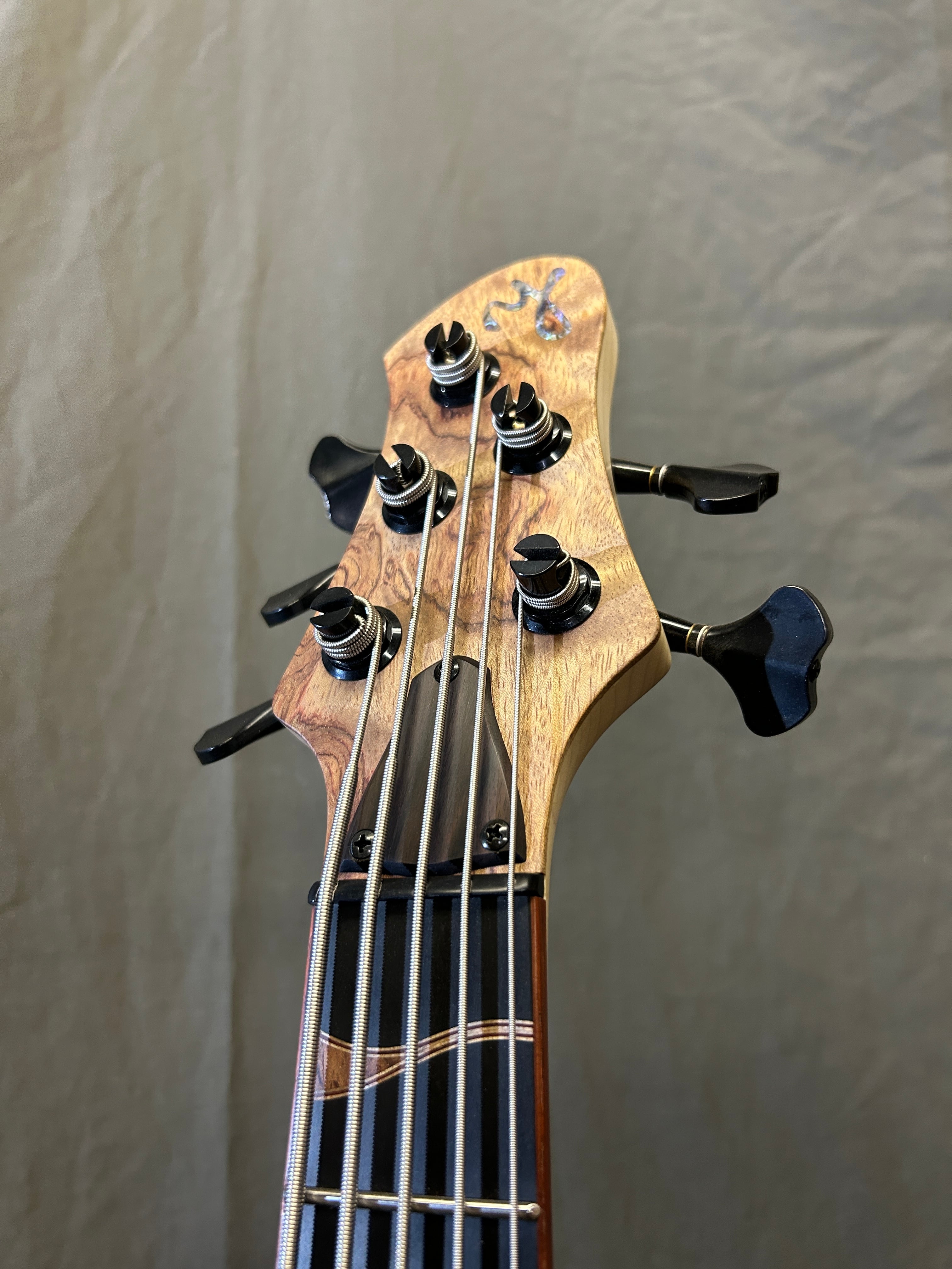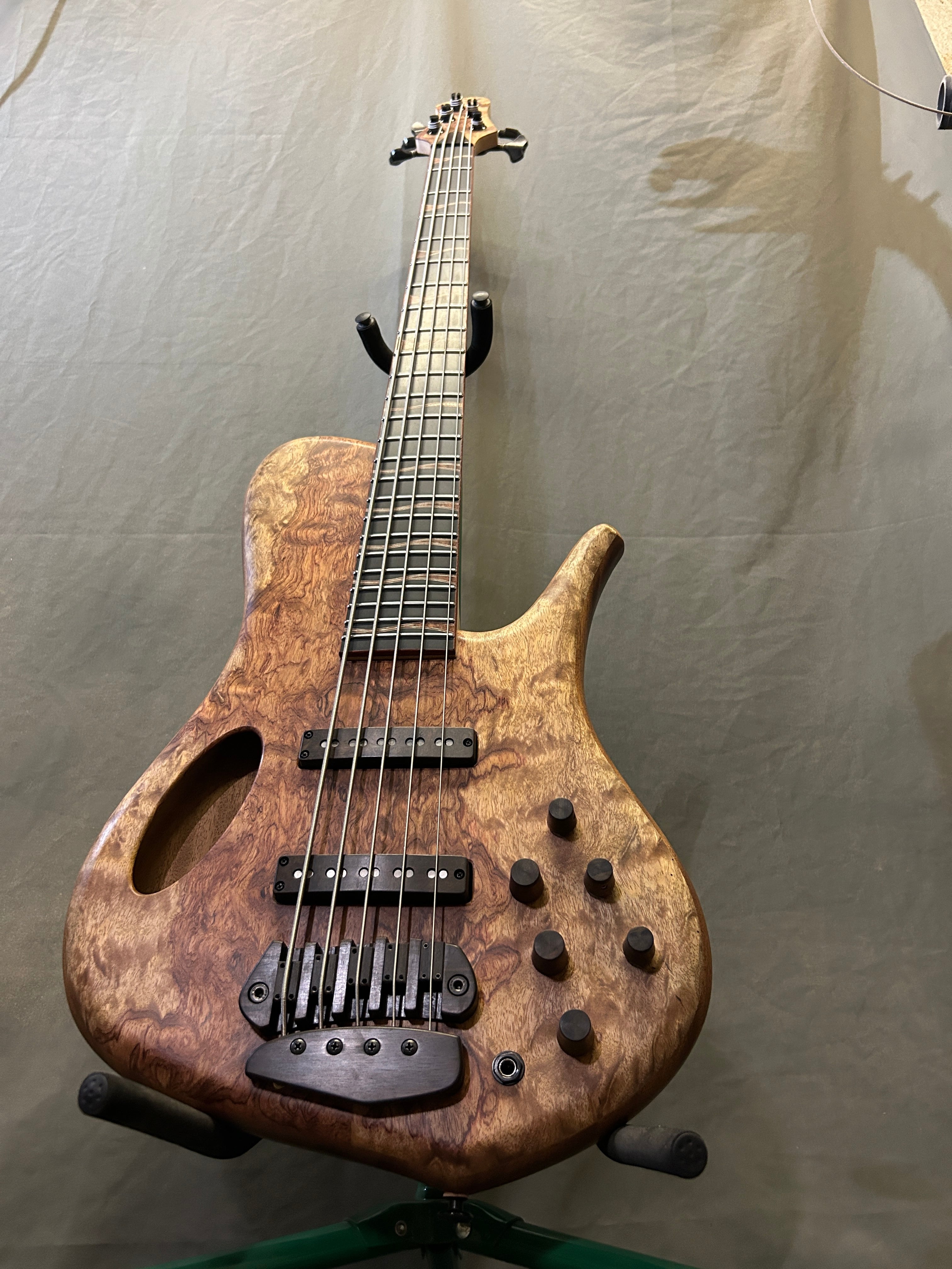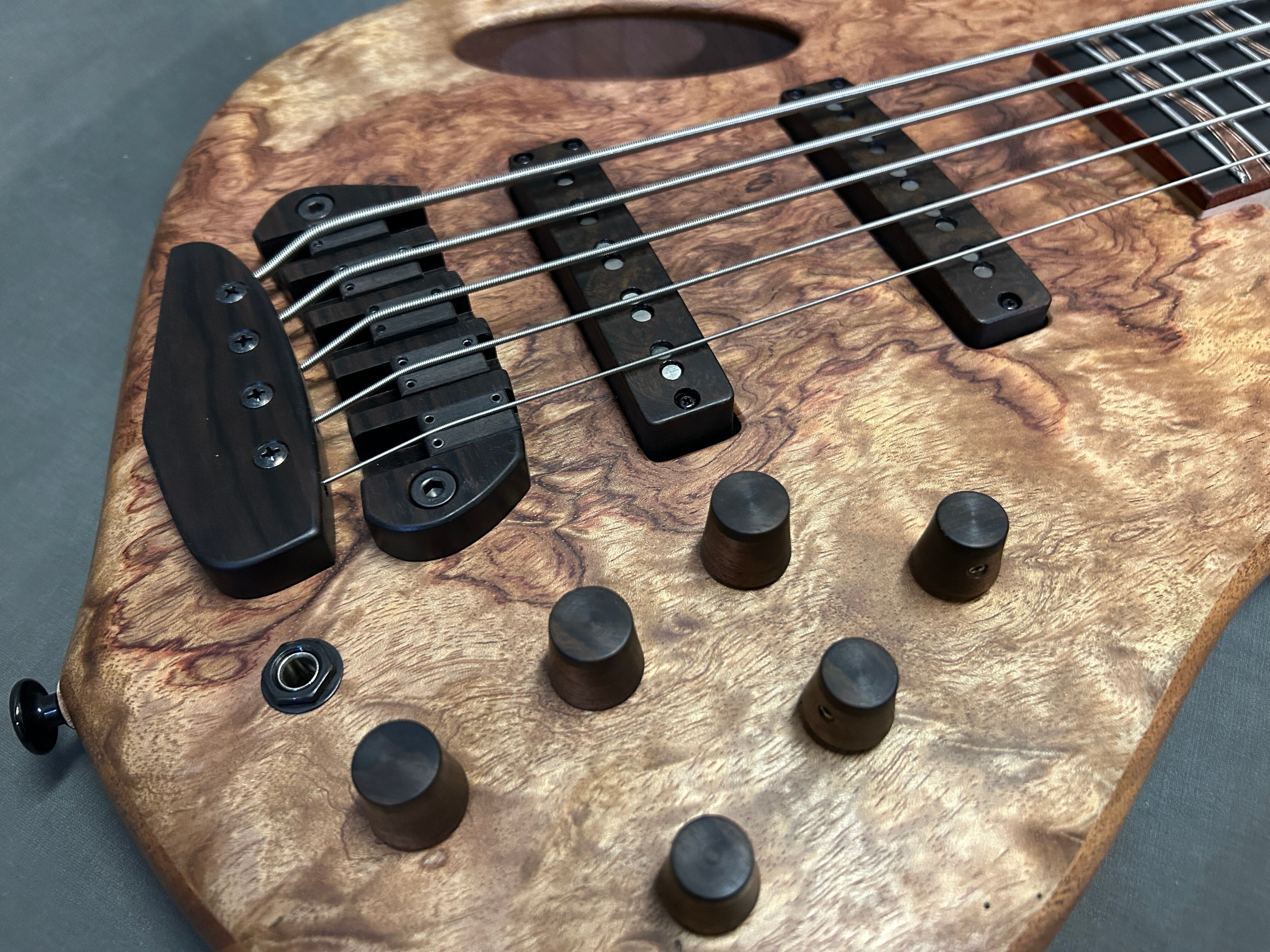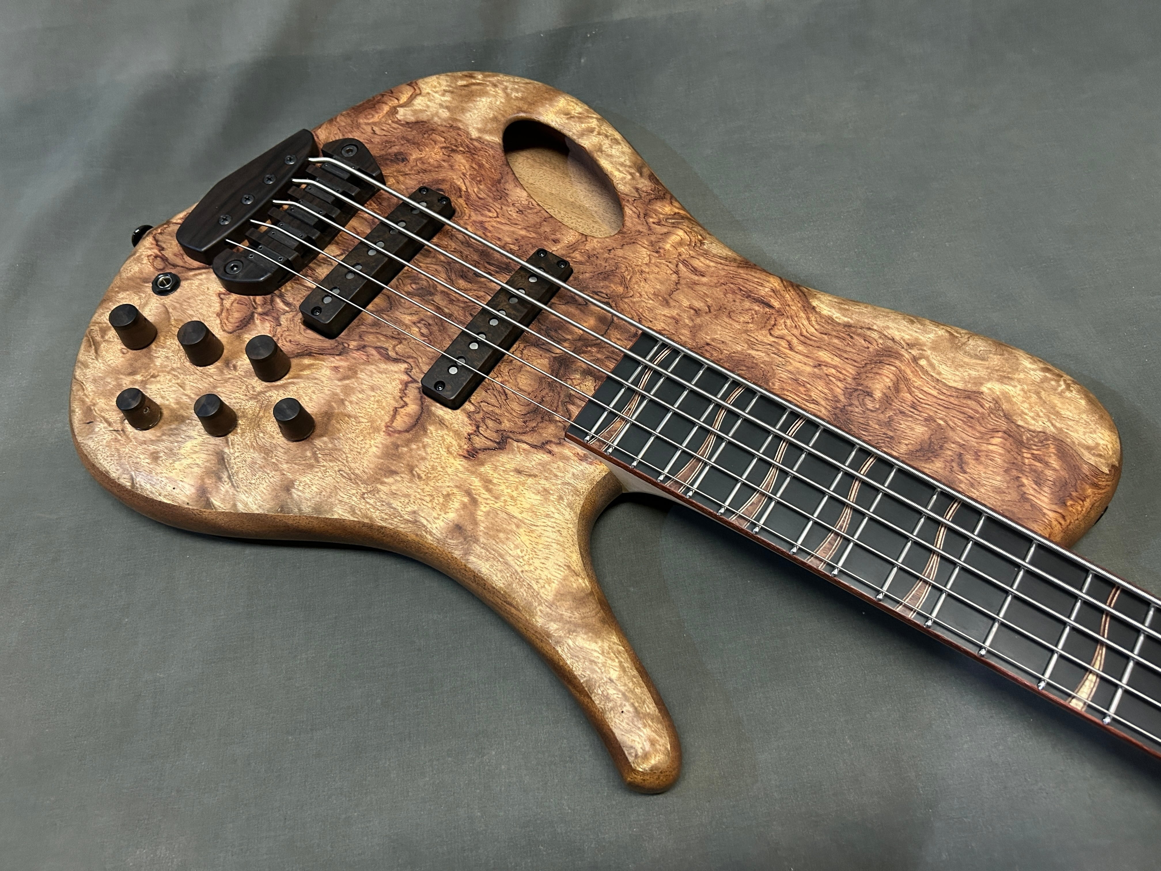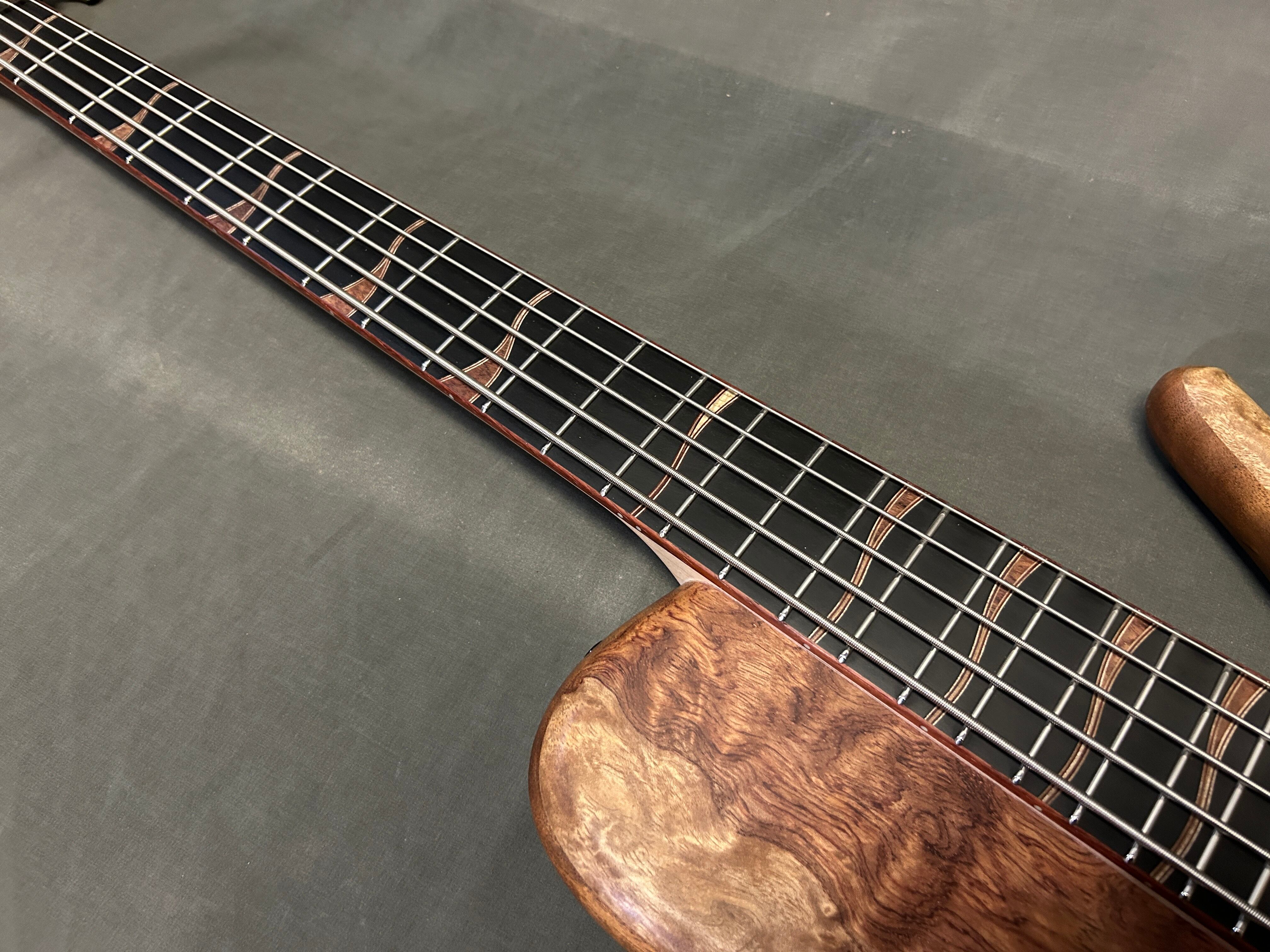 スポットで製作したシングルカット/セミホロー/セットネックの5弦ベースです。